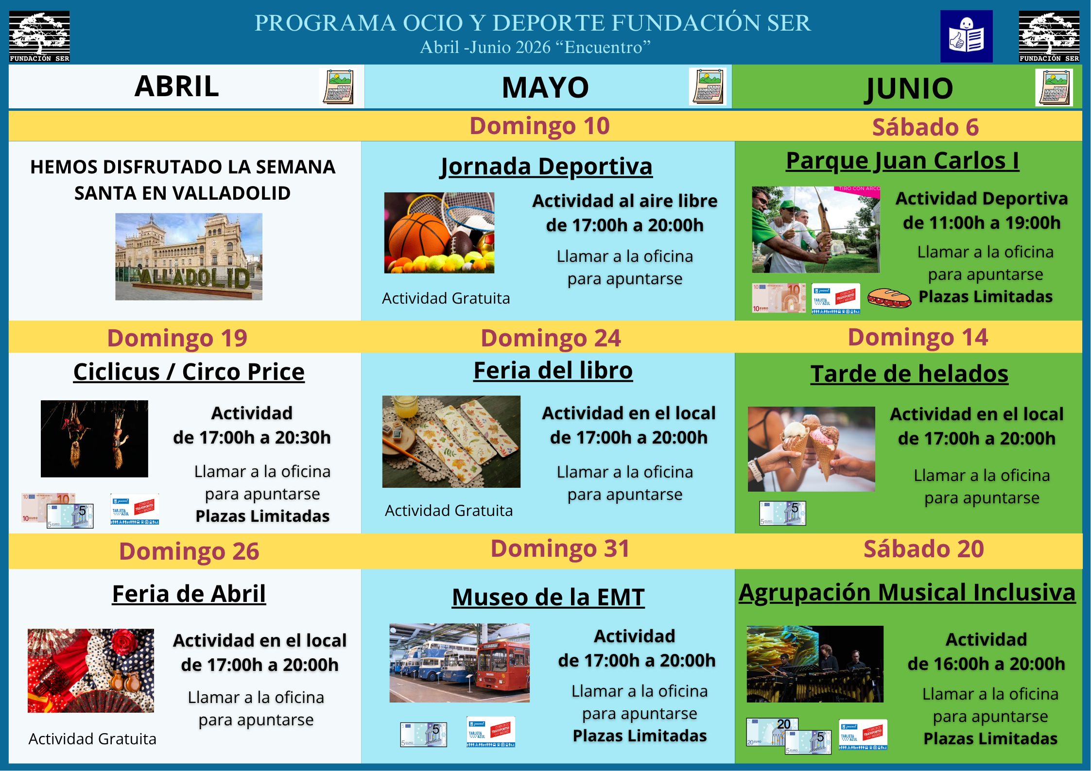 Disfrutaremos del arte escénico en el Circo Price, celebraremos nuestra particular Feria de Abril, realizaremos una tarde deportiva en el parque del Oeste, haremos actividades para celebrar la feria del libro y mucho más….