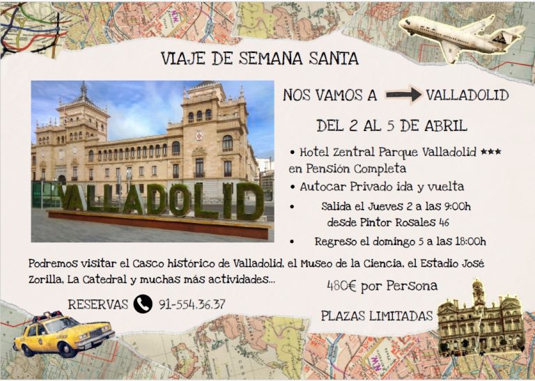 Y como podéis ver, también tenemos el viaje preparado para esta Semana Santa. ¡Nos vamos a Valladolid! Allí pasaremos cuatro días, disfrutando de sus calles, sus casco histórico, museos, procesiones ¡y mucho más! Si te gustaria venir a disfrutar esta Semana Santa, llama lo antes posible a nuestras oficinas para apuntarte, que las plazas son limitadas y vuelan.
